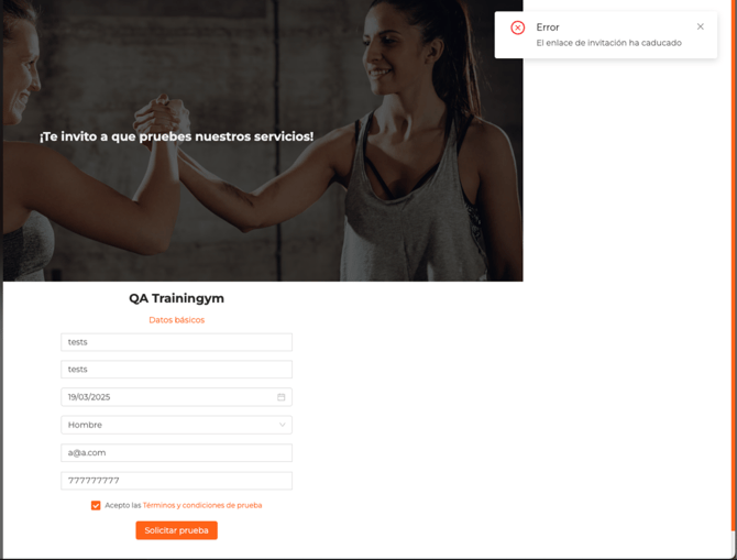 ⚠️ Si cuando el socio potencial rellena el formulario de prueba el socio embajador se encuentra de baja en el centro, aparecerá un mensaje de error y, por tanto, no aparecerá el registro en el listado.