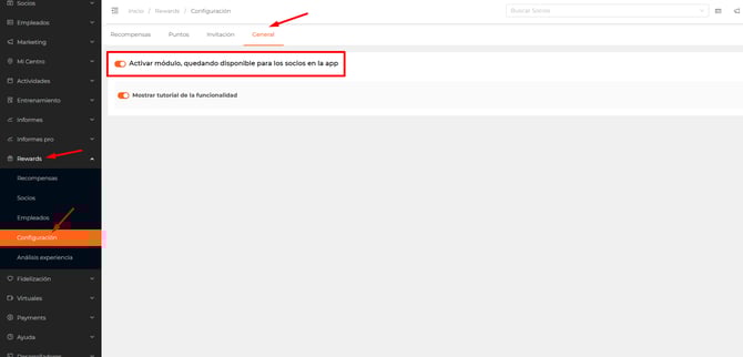 - Si se activa el módulo, todo lo relacionado con este aparecerá a los socios en su app y para los empleados, dependerá de los permisos configurados, podrán acceder al menú Trainingym Rewards®.