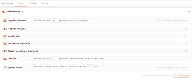 Desde el apartado Puntos podrás activar, desactivar y configurar 6 secciones: