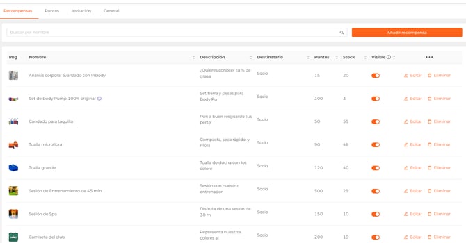 Aquí encontrarás el listado de recompensas creadas por tu centro, además de las siguientes opciones: