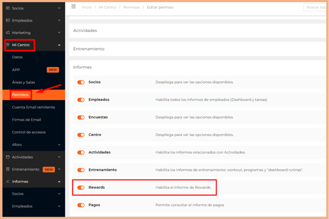 Si no tienes habilitado el menú Trainingym Rewards es porque tu permiso no tiene activada esta opción. En este caso, deberás comunicárselo al administrador de tu centro.