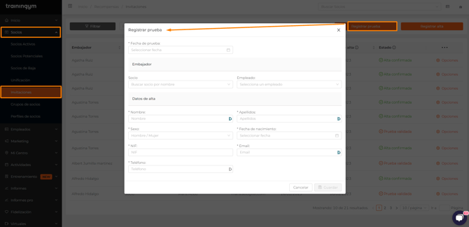 Invitado: nombre y apellidos del socio que prueba o se da de alta.