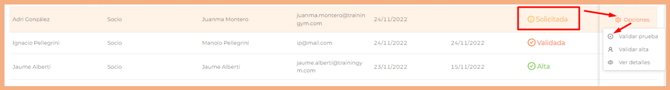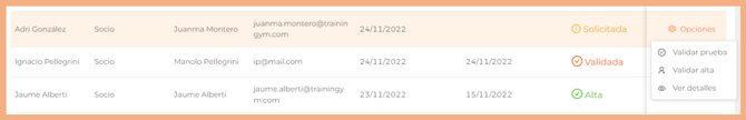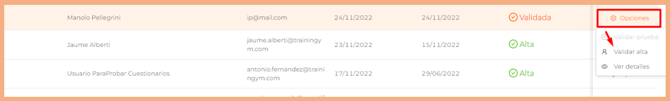 Cuando la ficha del cliente sea exportada a Trainingym, podrás validar su alta desde el listado "Altas y pruebas".