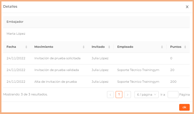 Se entregarán los puntos correspondientes al socio embajador que le envió la invitación, quedando grabada la operación en el histórico de puntos del socio.