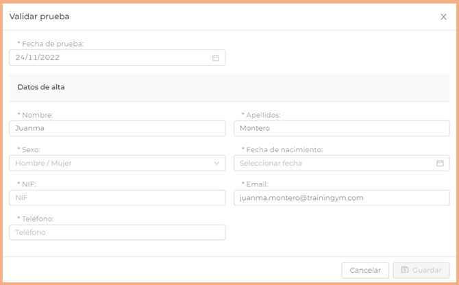 - Nombre del interesado: nombre y apellidos del socio que prueba o se da de alta. Obligatoria.