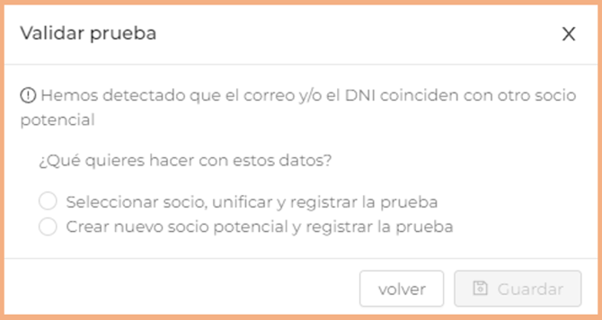 En caso de detectar uno o varios socios potenciales con el mismo email o DNI introducido, el sistema nos dará la opción de: