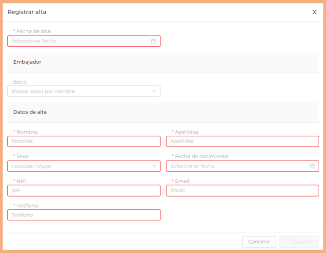 Embajador: nombre y apellidos del socio que invita o recomienda. Obligatoria.